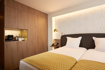 La ropa de cama de primera calidad crea un refugio acogedor para los viajeros cansados. Todas las habitaciones disponen de servicio de champán, cortinas opacas y cenas 24 horas para los antojos de medianoche.