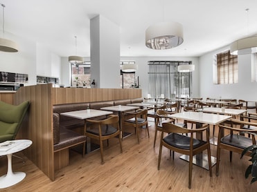La cafetería del hotel sirve sabrosos desayunos cocinados a la carta. Las comidas de la mañana se preparan tal y como les gustan a los huéspedes.