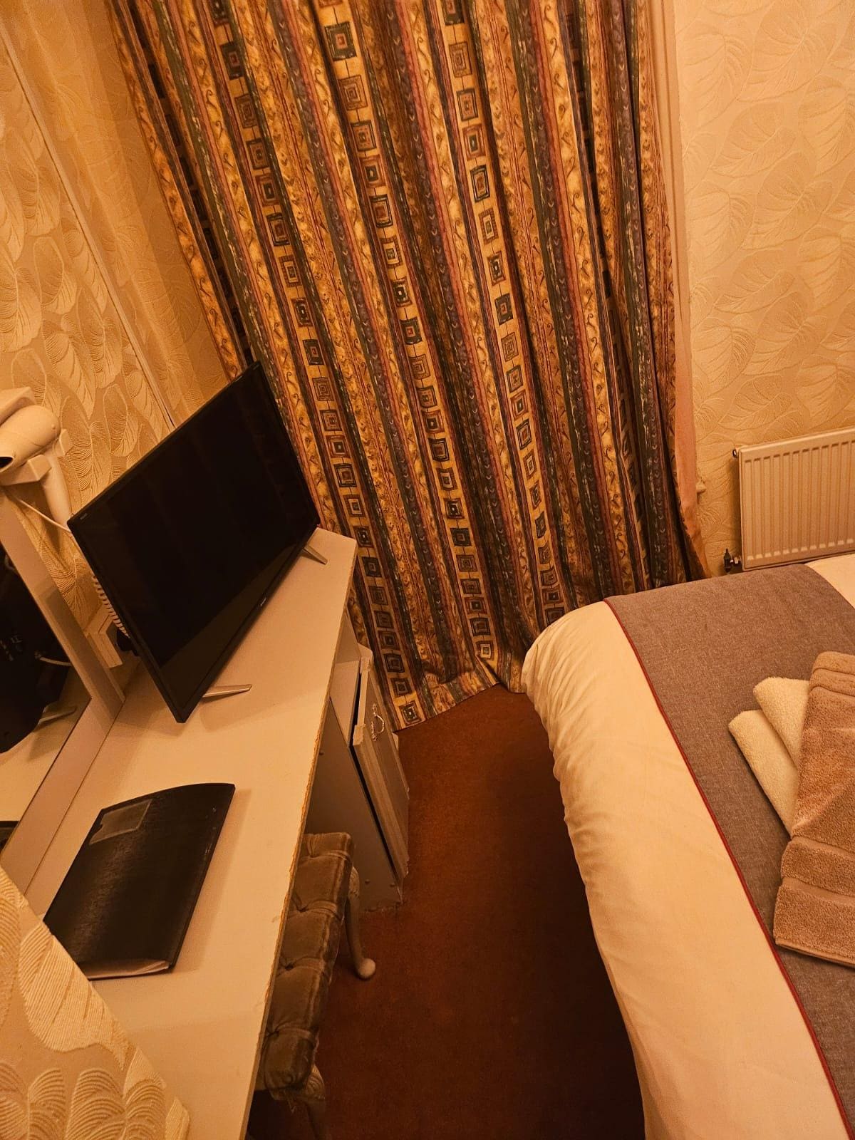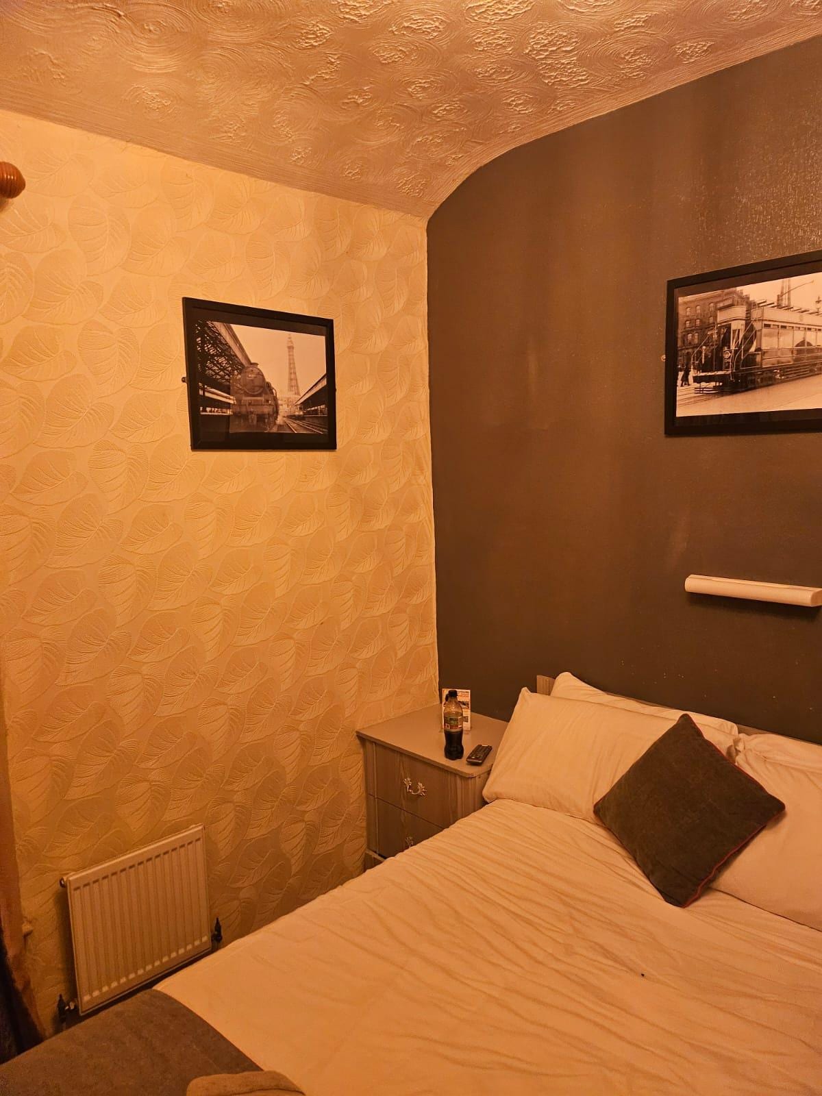 The room was very dated , tired and in need of modernising , old non working heaters still attached to the wall , radiators that was not turned on ( were in December ) and all that was in room was a little plug in heater that was not even turned on .. when asked at reception for a second heater to go to room while we went outside to warm up was told the heater would go straight to the room and be turned on so the room was warm on our return .. 1 hour later and we get back into room to find no more heaters .. so went to reception and she said .. oh yeah I forgot I was cooking dinner .. on the morning of check out no sign of life at reception and the lights out and no instructions as to where to leave room card .. Look it’s Blackpool and I get the rooms and prices reflect what you get BUT I also think any paying customer should feel they have get value for money .. and I can’t say I felt that on this occasion .