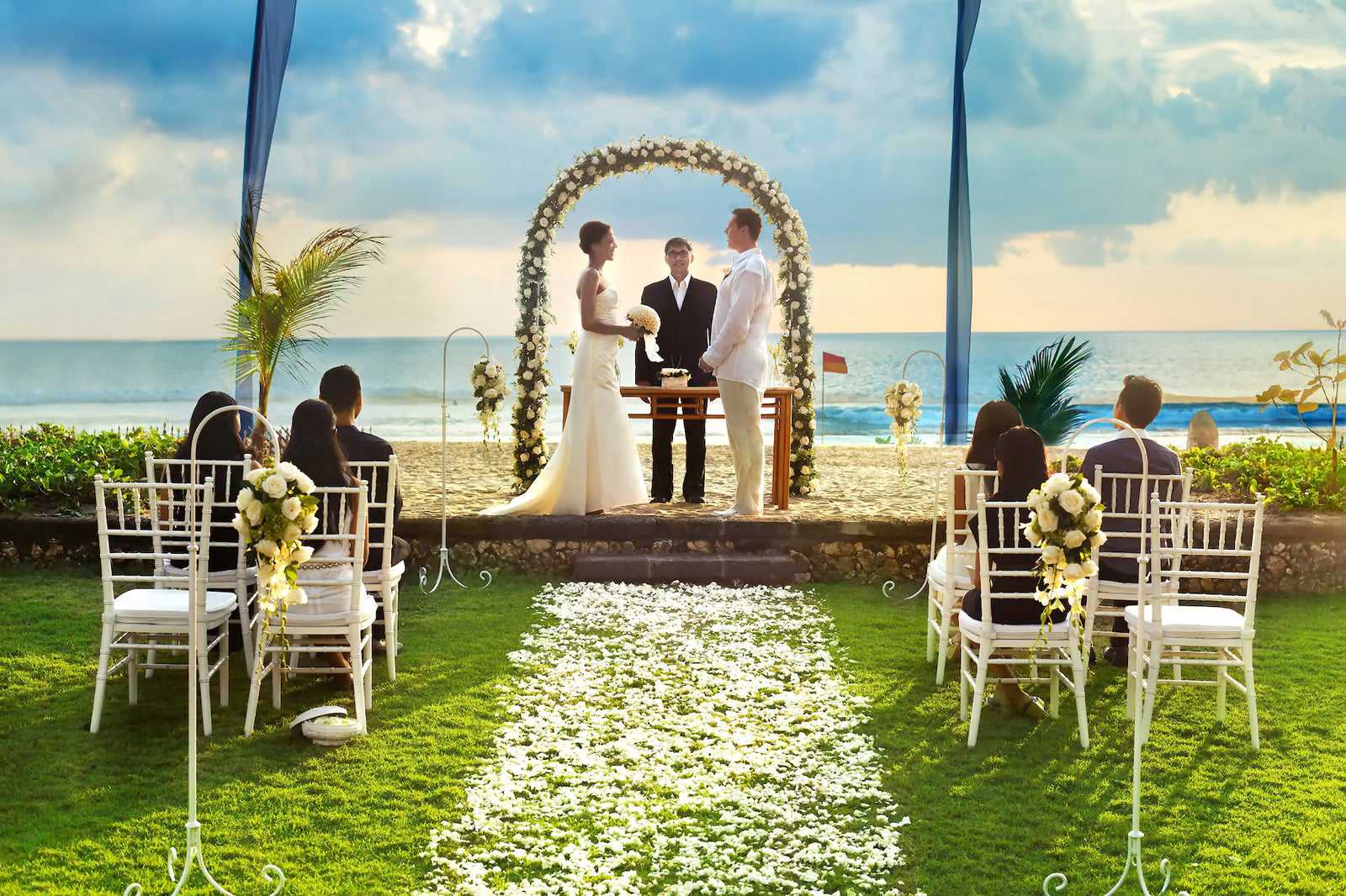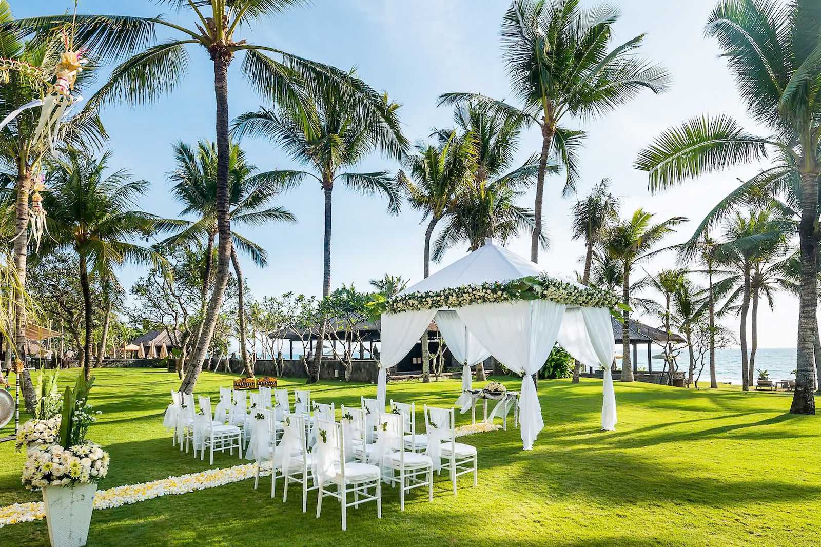 Western weddings in Bali can be arranged at most 5-star resorts on the island. A celebrant usually officiates the ceremony, but you can request for an official priest in advance. Weddings often take place at the resort’s onsite chapel, while venues range from outdoor setups to indoor ballrooms. There are usually wedding planners to help take care of every detail, including floral arrangements, live music, food and wine.