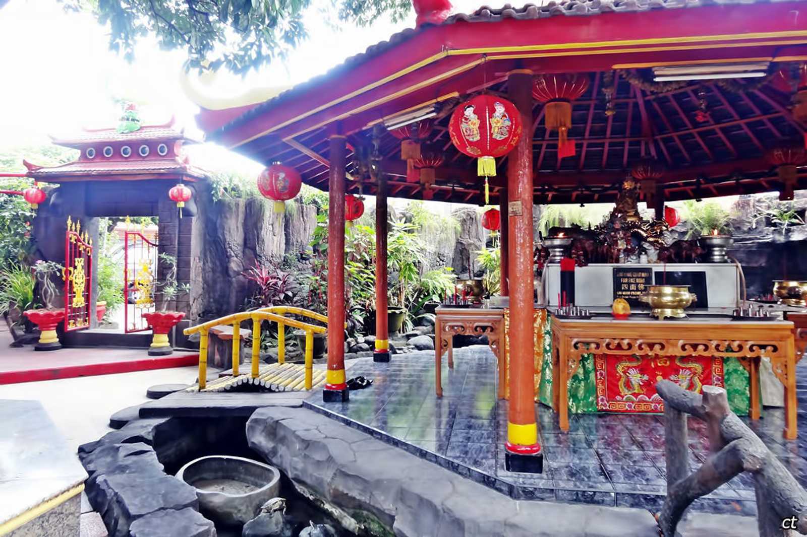 Next to the Baktisala is a smaller structure, the Dharmasala, where family prayers take place in front of smaller relics, various Chinese deity figurines and a wall mural of Borobudur Temple. Opposite the Baktisala and under a banyan tree is a unique place of worship where prayers are made to the ‘4-Faced Buddha’. This spot is surrounded by a small moat where a collection of turtles swim around or bask on stones, offering quite a peculiar sight.