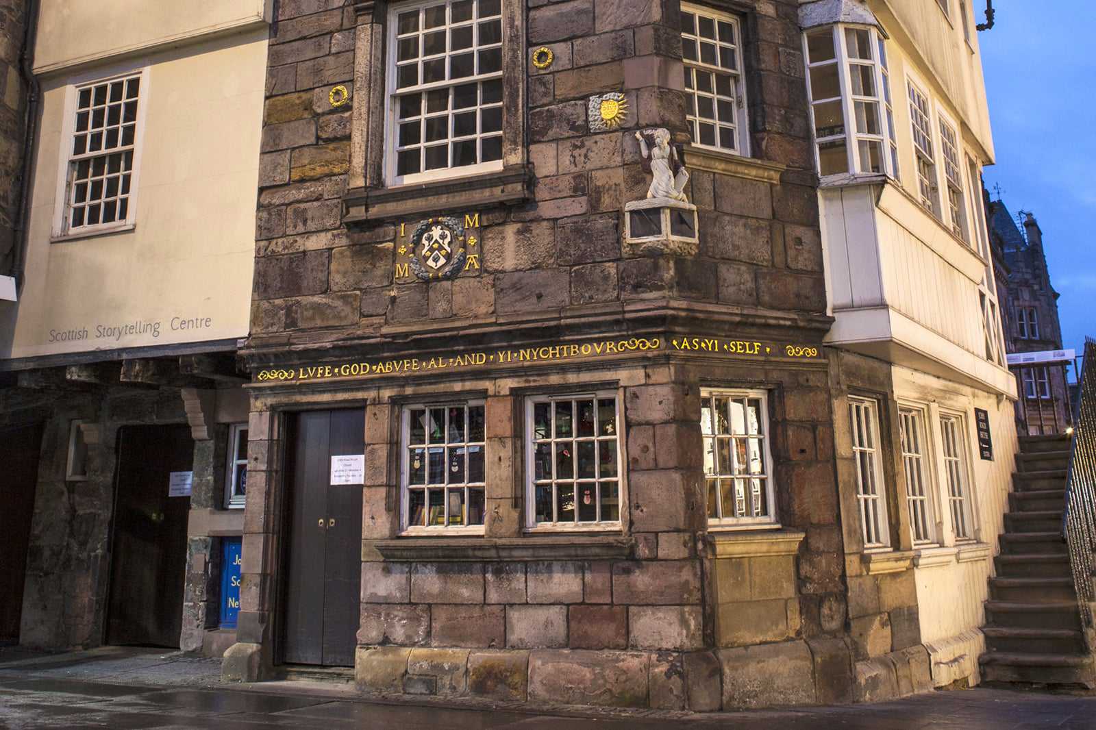 The House was originally built in 1556 by Mariota Arres and James Mossman and is still adorned with their coat of arms and inscription, “Lufe God abufe al and yi nychtbour as yi self.” While the house is named after John Knox, it is unknown if he resided there, but he was a frequent visitor and is thought to have lived there briefly before his death. John Knox was a challenging adversary of Mary, Queen of Scotts because of his function as both the founder of the Scottish Presbyterian Church and leader of the Scottish Reformation, which lead to the overthrow of Mary, Queen of Scots after the civil war. The association with Knox did save the historic space from being destroyed in the 1840s. In the 1800s , the building was restored and was opened as a museum.