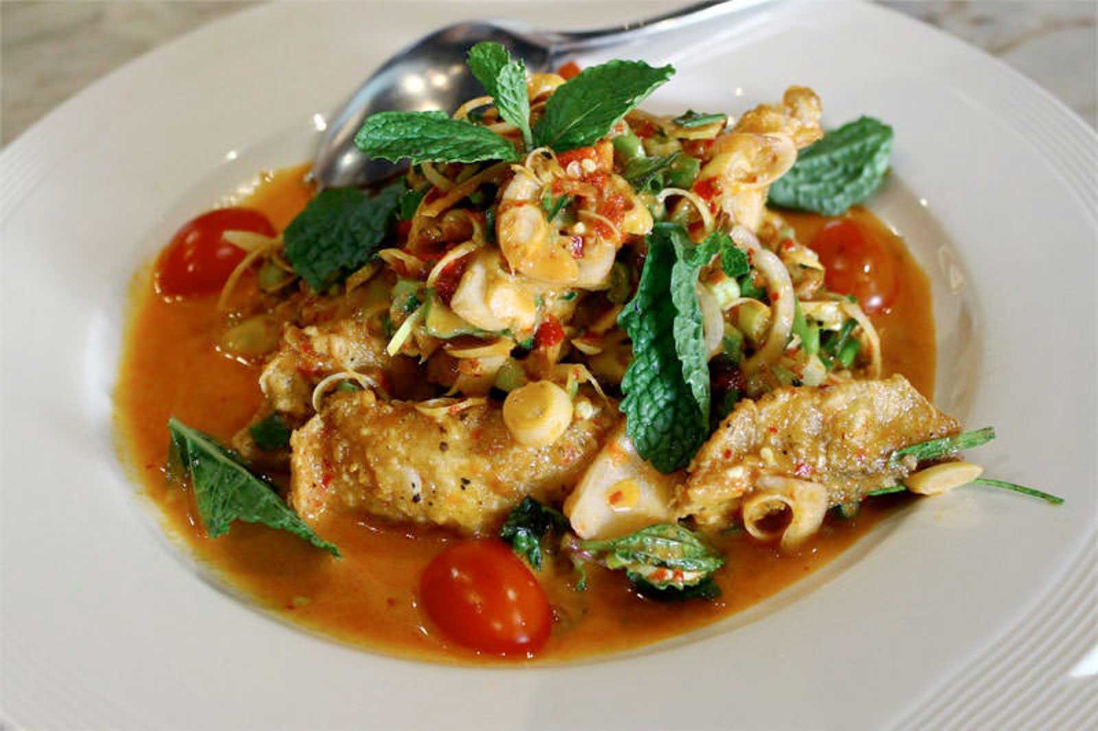 Calamari is another consistently tasty option, and the sea bass with greens in chilli and lime sauce is delicious, made with a spicy and sour sauce that is thickened with coconut milk and enhanced with sprigs of crunchy lemongrass.