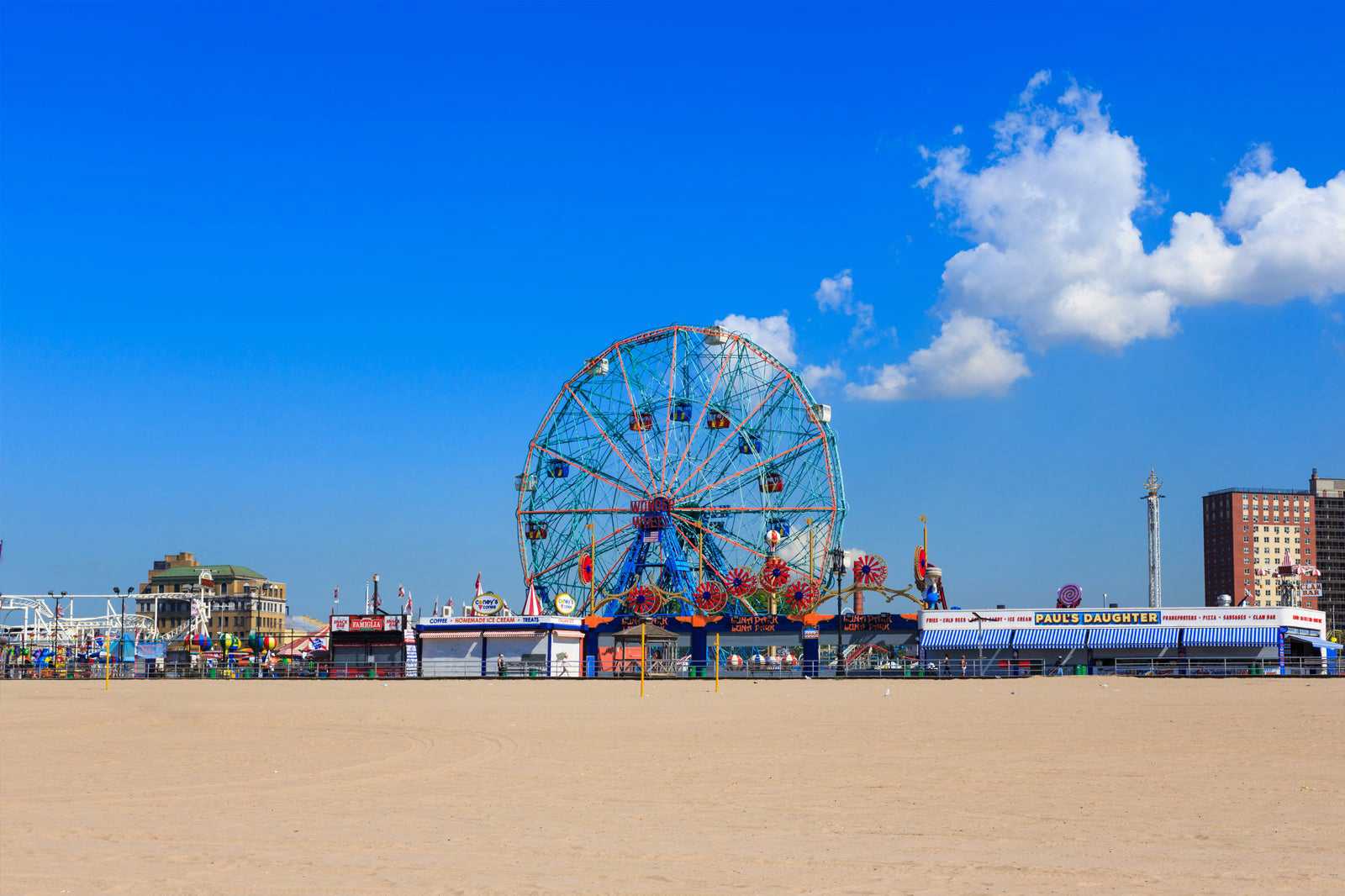 Coney Island is famous for being an amusement resort – along the beach, you’ll find 2 theme parks still thriving today: Luna Park and Deno’s Wonder Wheel Amusement Park.