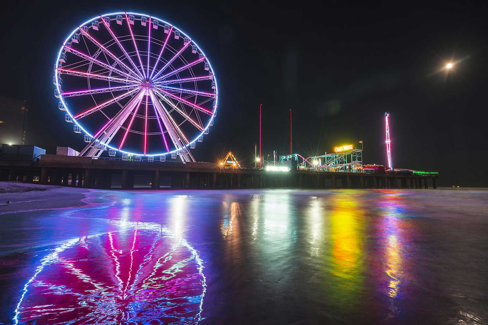 For a more casual atmosphere, the Wheel Bar on the Wheel Deck offers a place to enjoy a leisurely drink or photograph the sunset. Along the boardwalk near Steel Pier are many other places that offer a variety of both classic and unusual flavours, such as BBQ funnel cake.