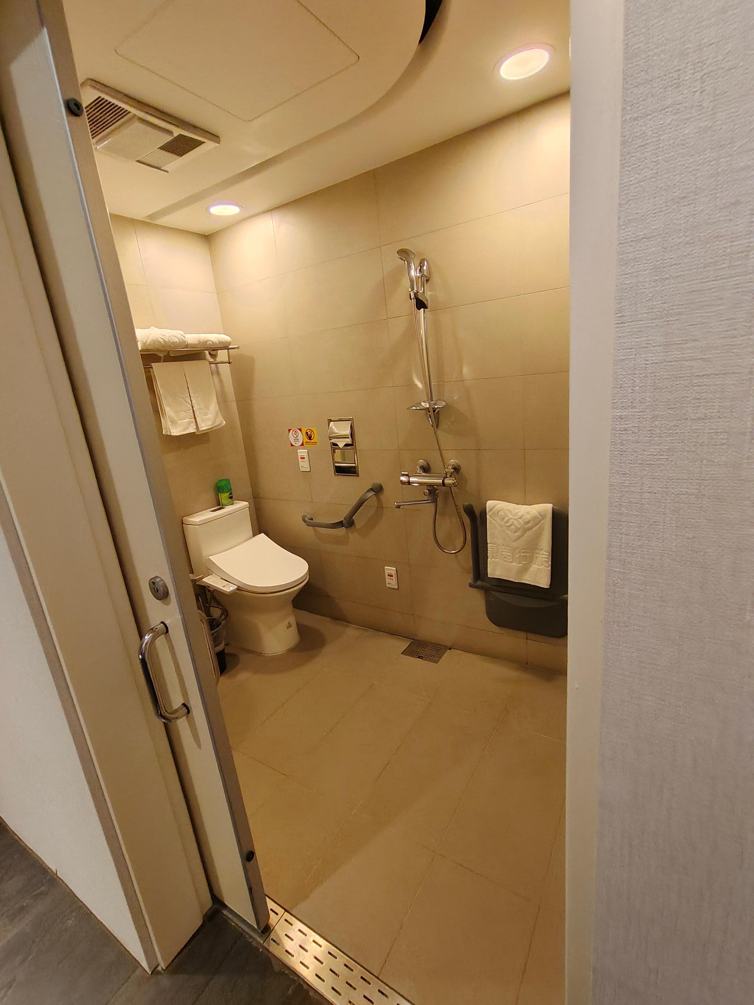 客房幾乎沒有什麼設施,洗手間沒有乾濕分離,洗完澡後洗面盆坐廁廁紙全部都濕了,風筒只能插在電視機下面的插座,但是要放置也沒有地方。
