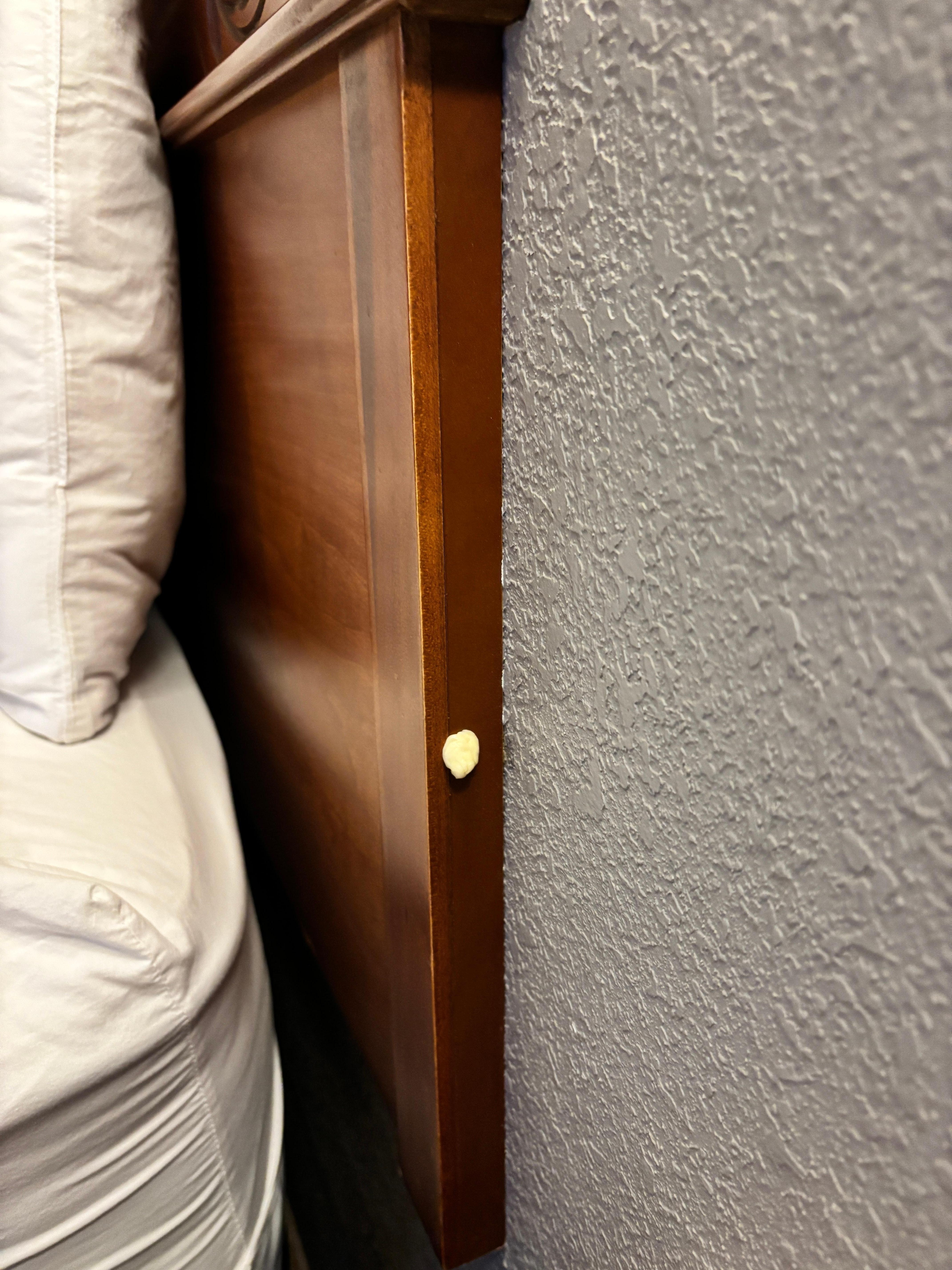 The headboard was so dusty there was already a handprint left in it from previous guests, which left nothing to the imagination and someone had thoughtfully stuck a piece of gum to the side of it. The “down” comforter didn’t even fit the bed, leaving the mattress exposed.