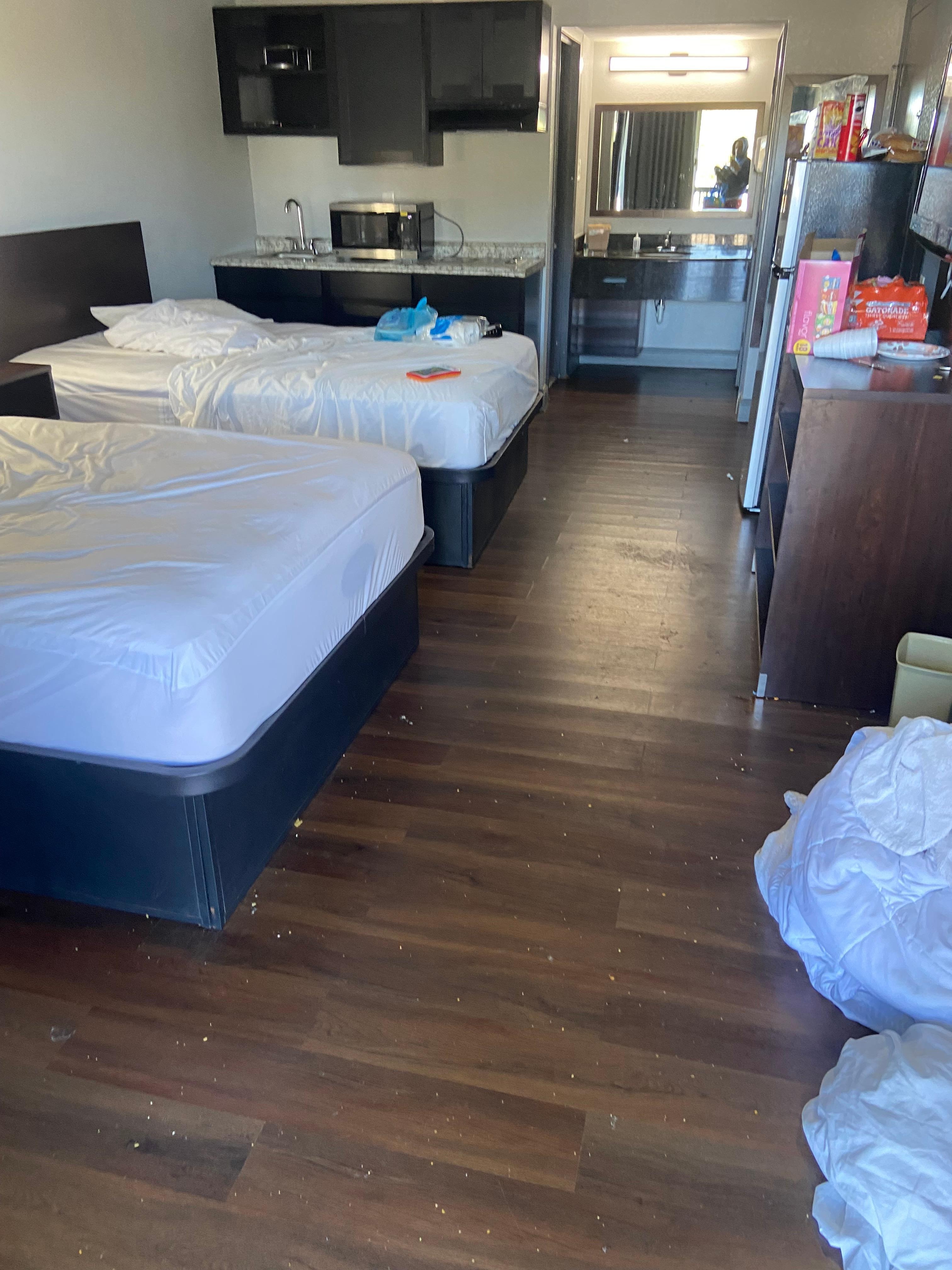 When I arrived, check in was smooth. However, I opened my door, and my room hadn’t been cleaned. The staff cleaned it quickly, and they missed some dirty towels and cooked ramen in the sink. I was willing to forgive that given they rushed. I later came back to the room, and I noticed water from a leak on the floor, roaches, AND DIRTY BEDDING. I mean stained pillows, red-brown mystery streaks with hair on the sheets, and dog hair all over the blanket. No housekeeping staff were around to help fix it. I didn’t care about the weed smoke in the lobby. I spent a terrible night here not sleeping and checked out a day early. I’ve never had a bad stay at a Red Roof Inn before. The hotel looked clean and cared for in the photos and reviews. I felt like I’d been catfished by the hotel. I thought Expedia was trustworthy. I will be contacting Expedia for a refund. Do not stay here.
